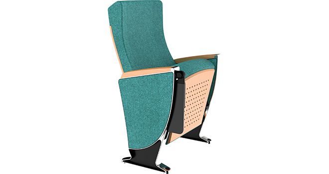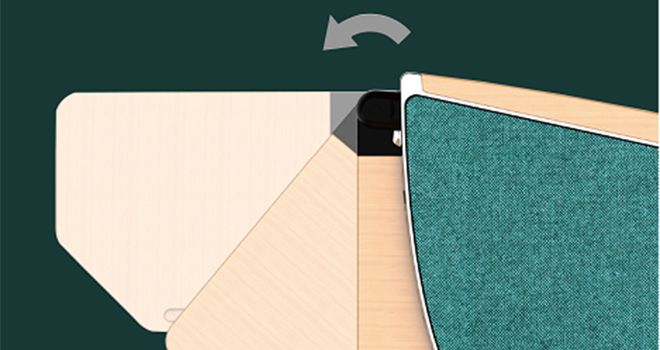La tavoletta scrittoio integrata in alluminio può ruotare di 90° e affondare nel bracciolo, risparmiando spazio.
